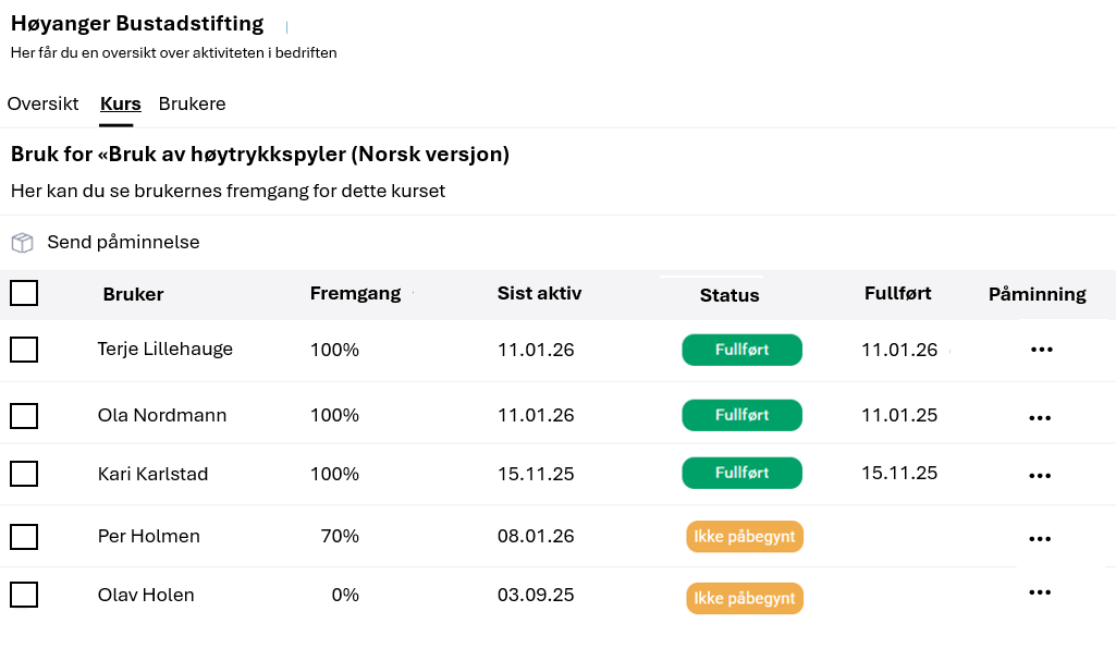 - Kompetanseoversikt: Ha full oversikt over din og dine ansattes kompetanse. Se kursfremgangen, resultatene, send påminnelser, m.m.